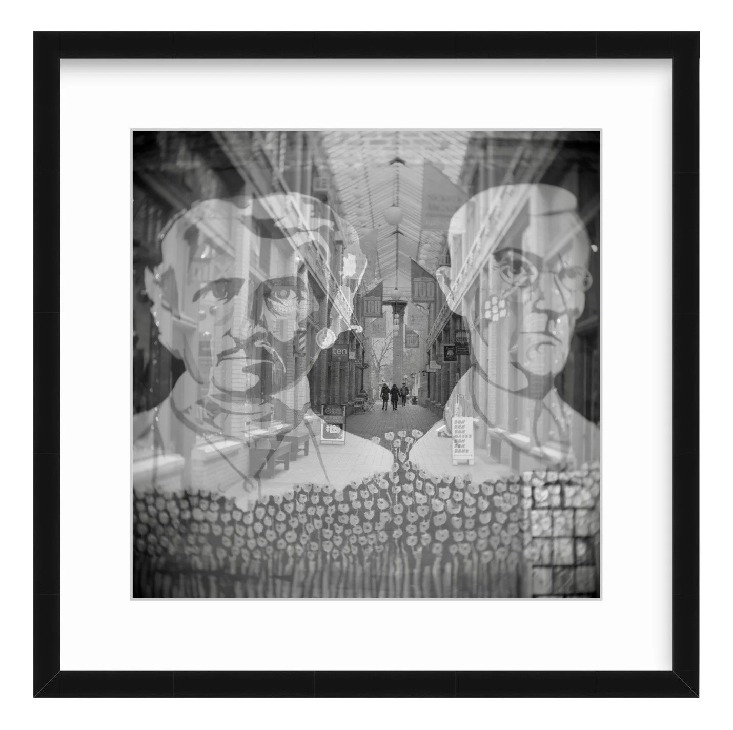 Black & white double exposure of the Bookstore Mural & Nickels Arcade, downtown Ann Arbor, MI.
